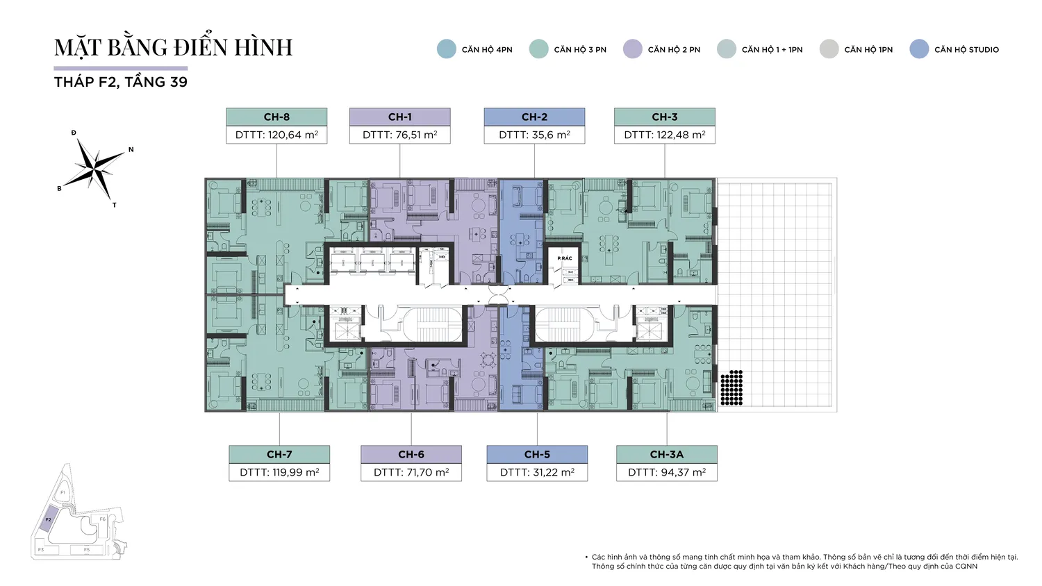 | 3PN | 4 căn (CH-3, CH-3A, CH-7, CH-8) | 94,37 – 122,48 m² |