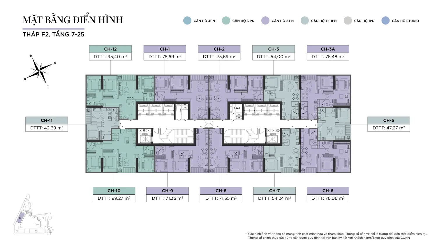 | 3PN | 2 căn (CH-10, CH-12) | 2 x 19 = 38 căn | 95,40 – 99,27 m² |